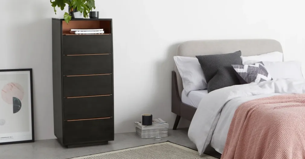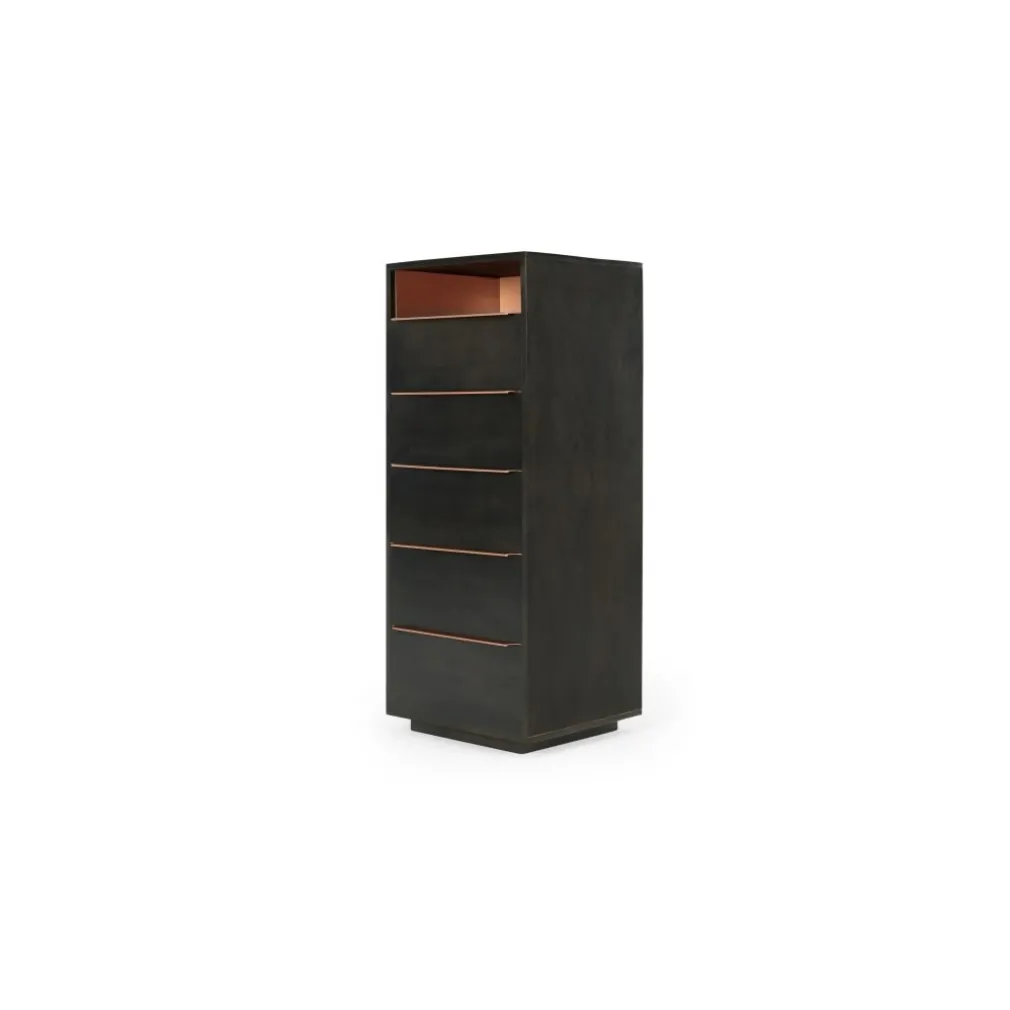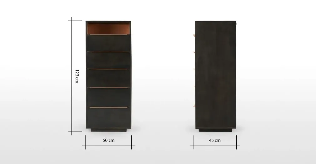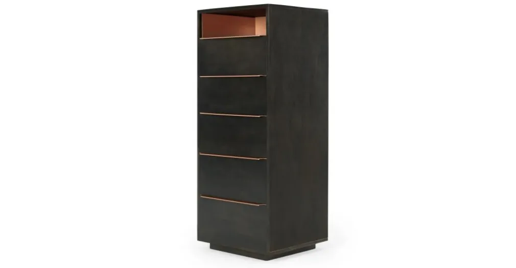 Una pieza fabricada en Melamina color sombra y acabado cobre, un color básico para tu dormitorio y hogar, la Cómoda Alta Anderson – Sombra no solo es muy resistente, sino que combina con otros elementos. Se trata de un material de gran durabilidad y su forma te permite trasladarlo con fácilidad al lugar que desees.