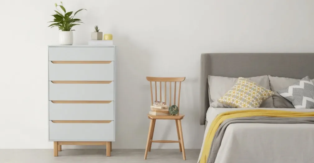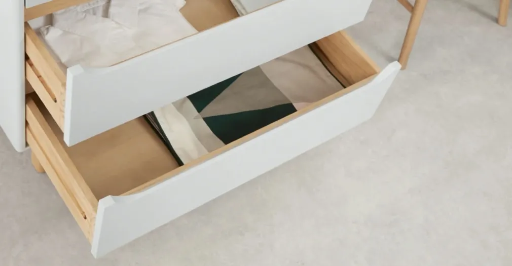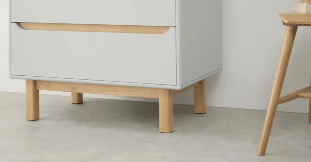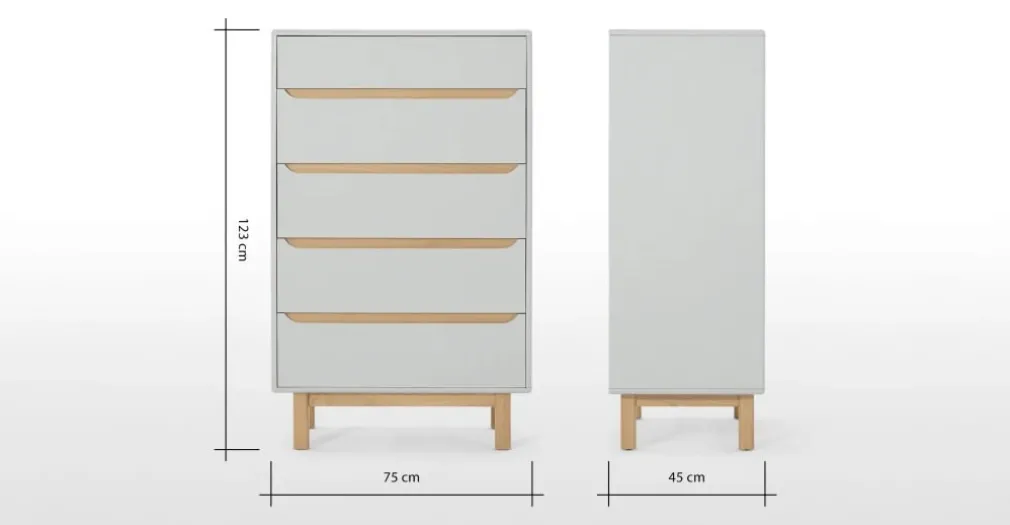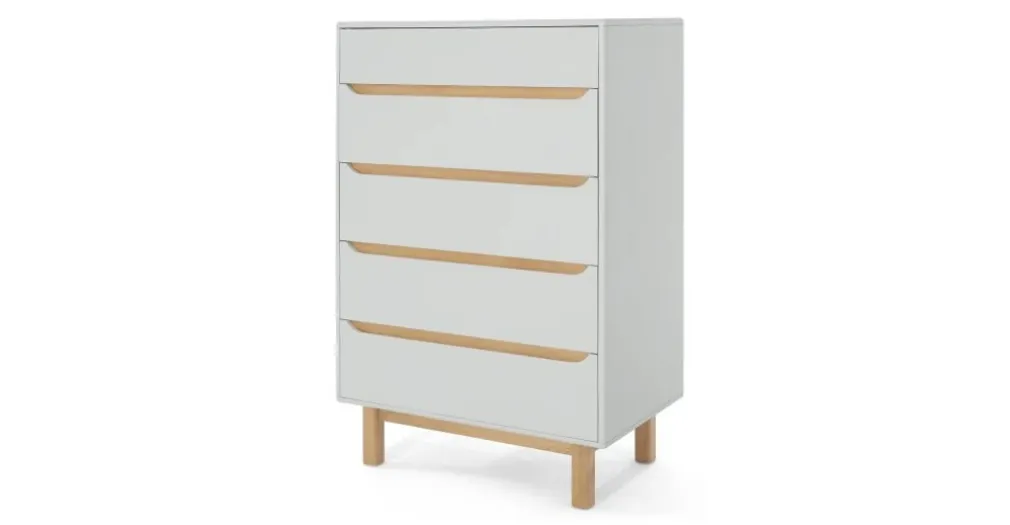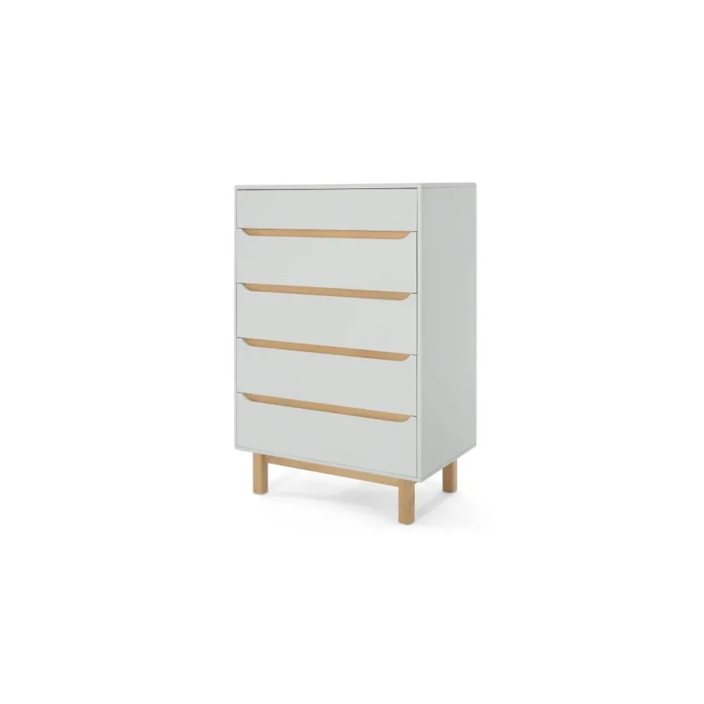 La Cómoda Alta Jayden, no solo es una pieza decorativa que te ayudará a organizar las cosas que mas gustes, si no también es una pieza que cuenta con materiales de calidad, asegurando durabilidad en cada uno de ellos. Esta pieza crea un ambiente nórdico en tu dormitorio, con sus tonos grises y las patas de roble natural en contraste. Esta pieza tiene 5 cajones para guardar todas tus cosas en su interior y dormir sin preocupaciones.