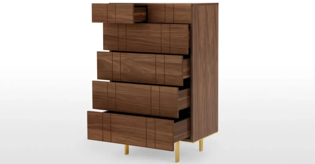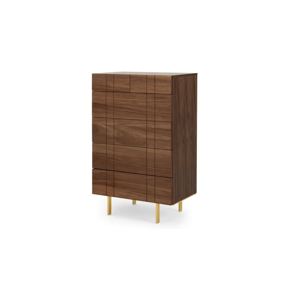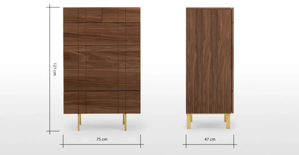 Amplia y distinguida es la Cómoda Alta Keaton – Nogal, una pieza importante al momento de ordenar tu habitación, sus líneas geometrías se aprecian en el cada uno de sus cajones siendo uno de sus atractivos, patas de acabado dorado. Sin duda YoloDecoro siempre está trayendo para ti, mobiliario para embellecer el espacio predilecto de tu hogar, sin dejar de lado lo funcional.