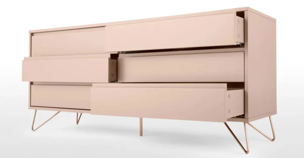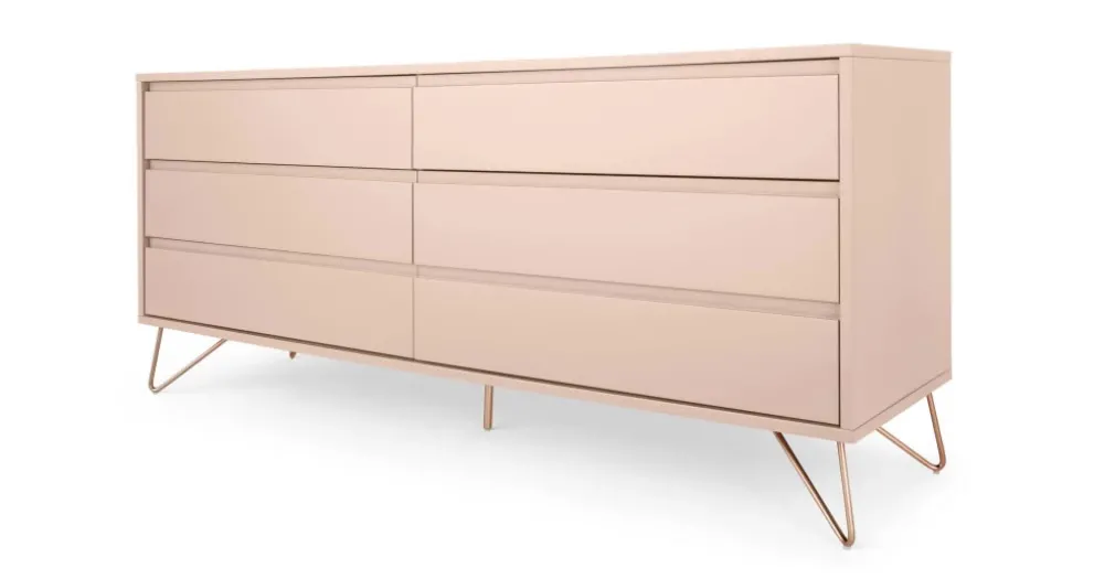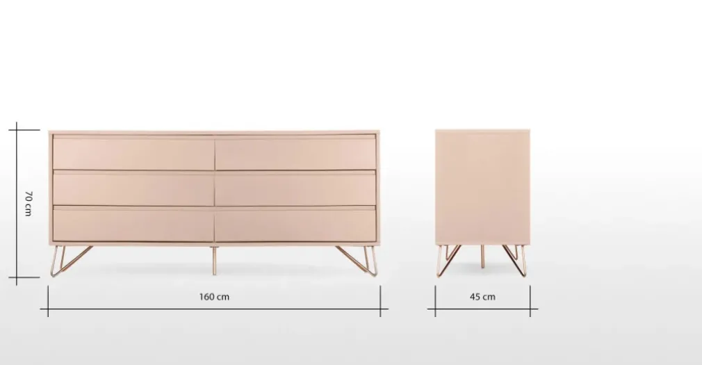 La Cómoda Ancha Elona – Rosa Empolvado, es un mueble de mayor elegancia ,cuenta con 6 cajones de amplio almacenaje, práctico y de tendencia en muebles de dormitorios, Sus amplios cajones te permitirá organizar en mayor proporción tu dormitorio; asimismo su acabado en color rosa y patas de acero, logra dar a tu habitación un aspecto inpecable en cuanto a diseño y calidad de materiales. La Cómoda Ancha Elona – Rosa Empolvado que Yolodecoro te trae, está fabricada con materiales de alta calidad; participando en ella el Melamine 18 mm y estructura de base madera y el acero.