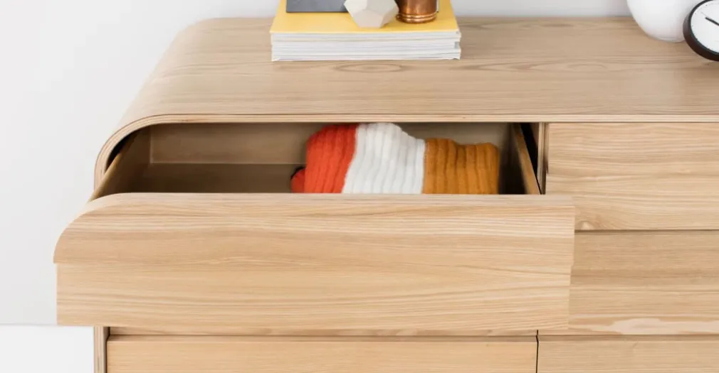 La tecnología de primera aplicada a la elaboración de este mueble logra doblar láminas de MDF para dar paso a esta bella obra rodeada de detalles que impresionan.