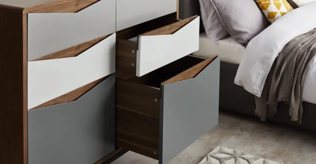 La Cómoda Ancha Louis – Nogal y Gris Carbón está compuesta por amplios cajones, cada uno acompañado de sus correderas las cuales se deslizan suavemente de manera profesional, tal como lo requieres.