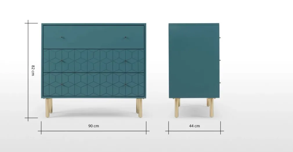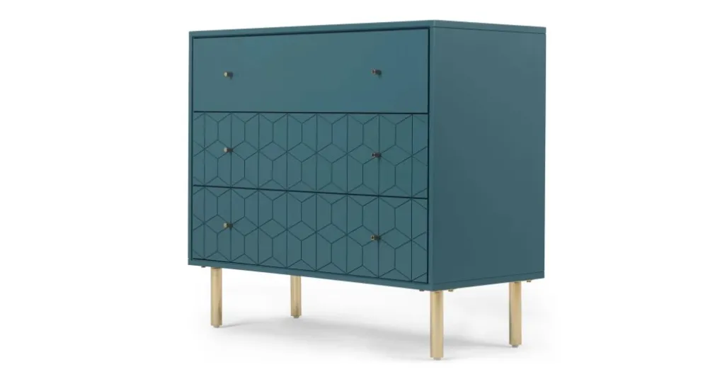 Amplia y distinguida es la Cómoda Hedra – Azul, una pieza importante al momento de ordenar tu habitación, sus líneas geometrías se aprecian en el segundo y tercer cajón siendo uno de sus atractivos, patas de acabado dorado, sin duda YoloDecoro siempre está trayendo mobiliario para embellecer el espacio predilecto de tu hogar.