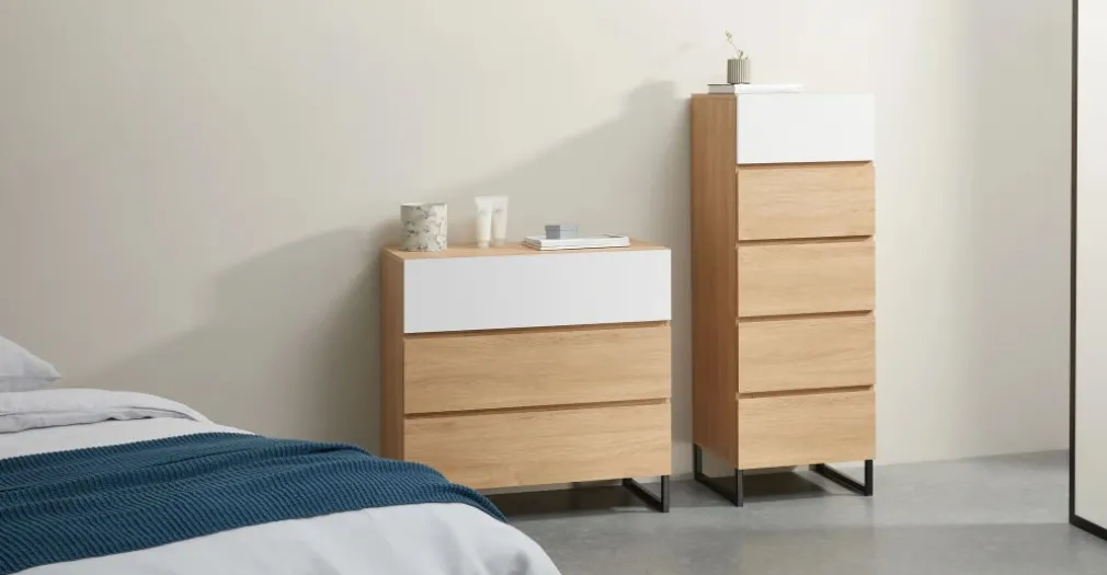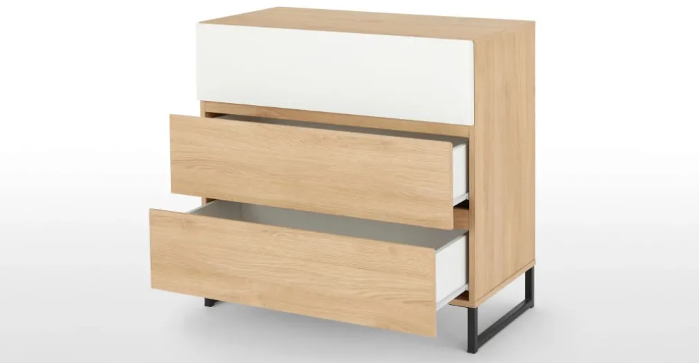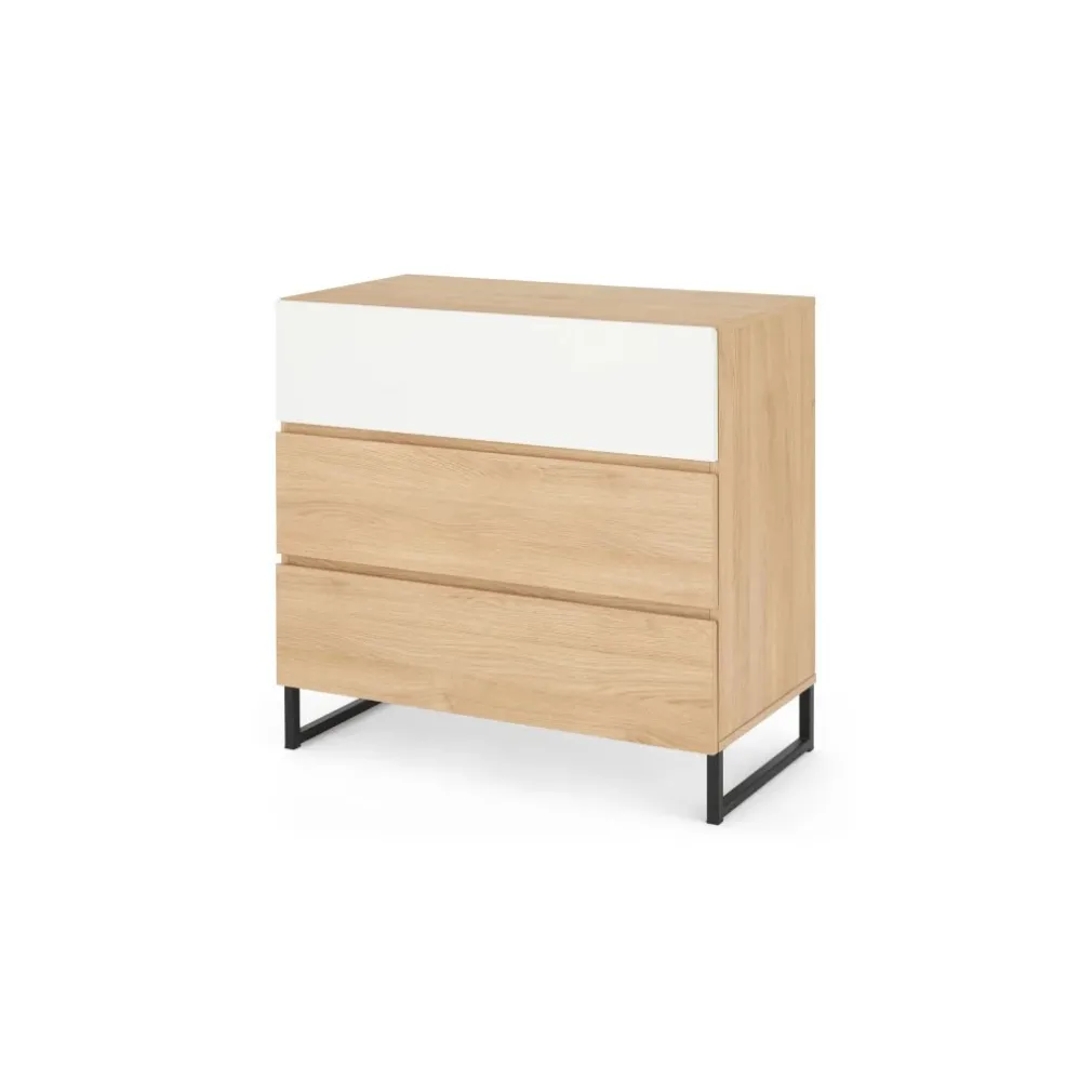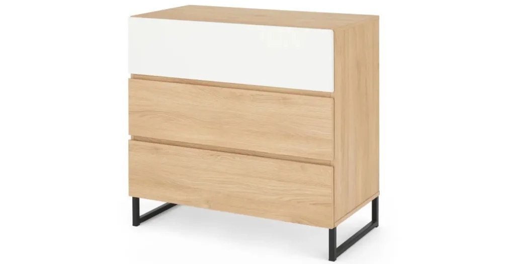 Esta pieza cuenta con 3 cajones de amplio almacenaje para que guardes tus cosas donde mas te guste. ¿Quieres orden? Luce tu Cómoda Hopkins – Efecto Roble y Blanco en cualquier parte de tu dormitorio que más te agrada.