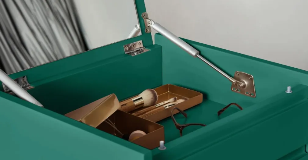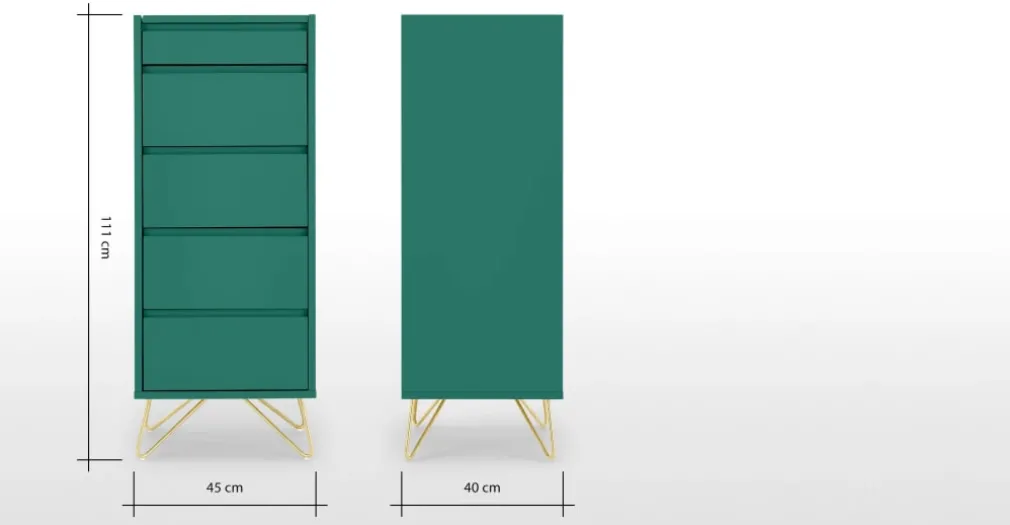 La Cómoda Tocador Elona – Verde Inglés , es un mueble que cuenta con 5 cajones, espejo elevable muy práctico, permitiendo organizar tu dormitorio; su acabado en color verde y patas en acabado dorado, logra dar a tu habitacion un aspecto envidiable en cuanto a diseño y calidad de materiales. La Cómoda Tocador Elona – Verde Inglés que YoloDecoro te presenta, está fabricada con materiales de alta calidad como Melamine 18 mm y estructura de base madera, patas de acero.