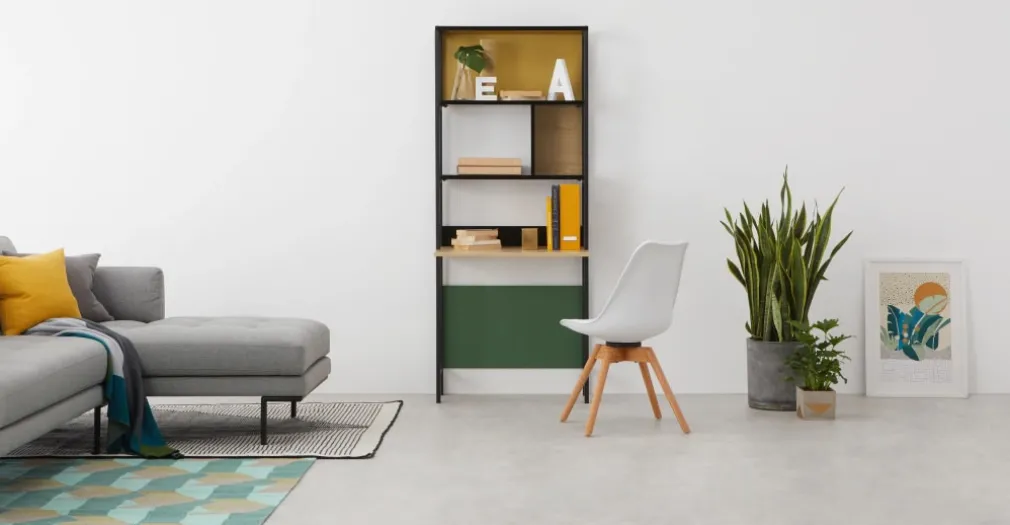 Todo en un solo mueble, estantes y escritorio la función que resume una filosofía decorativa sencilla pero de variedad en funciones. Si lo que quieres es concentrarte en colores mágicos para este nuevo ambiente, este escritorio reluce por su juego con la gama de tonalidades en combinación con tu diseño personal.