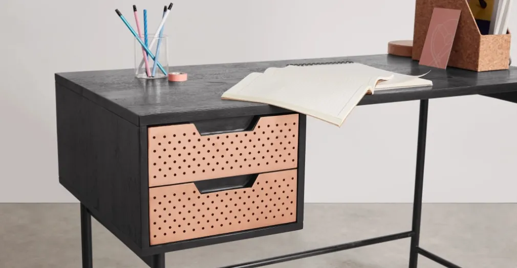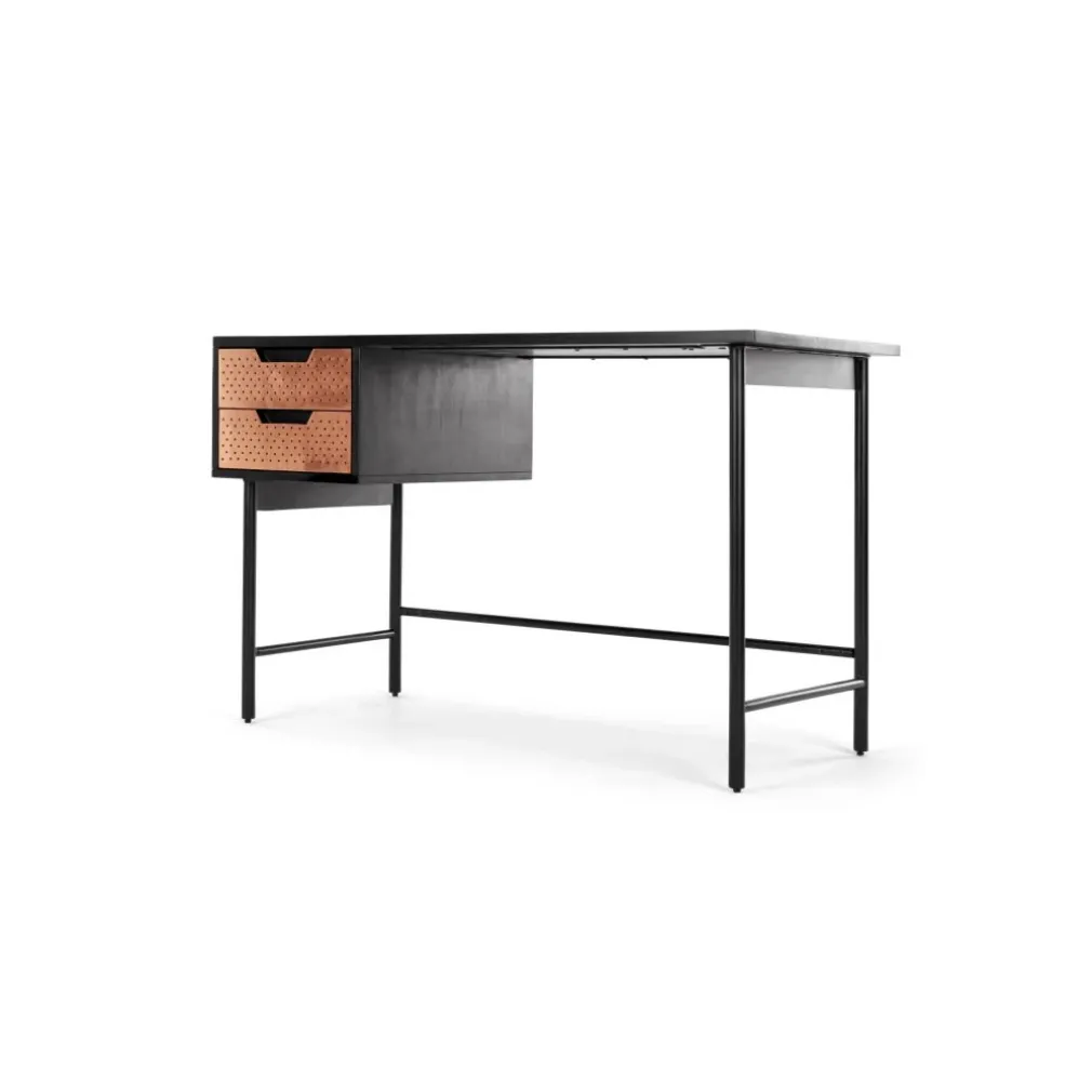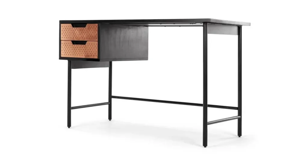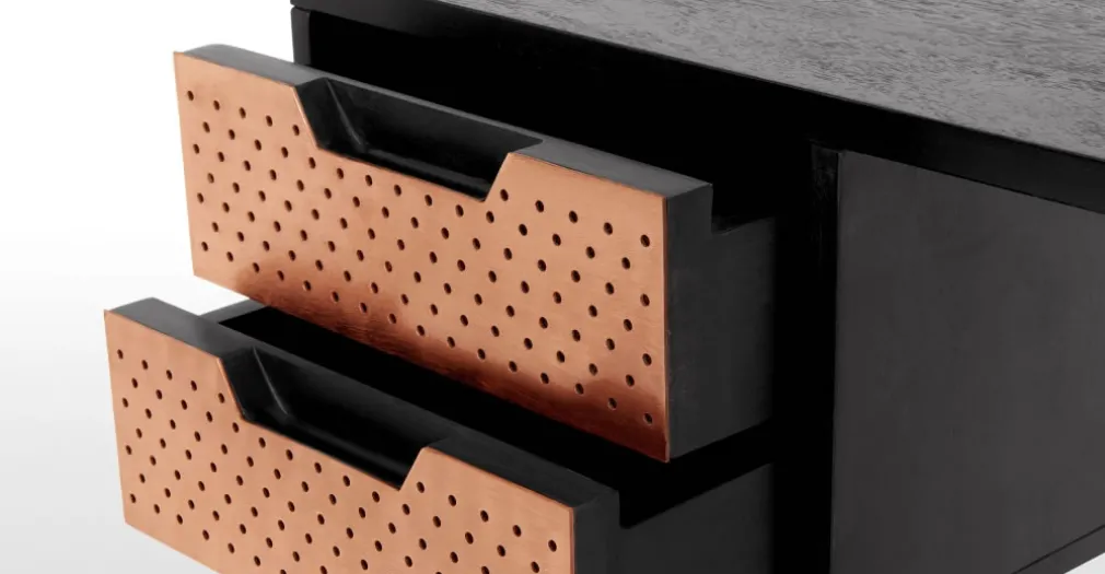 Este elemento decorativo se destaca por su diseño y materiales de vanguardia capaz de transformar un espacio de forma rápida. Sus cajones sorprenden cubiertos por un acabado en color cobre.