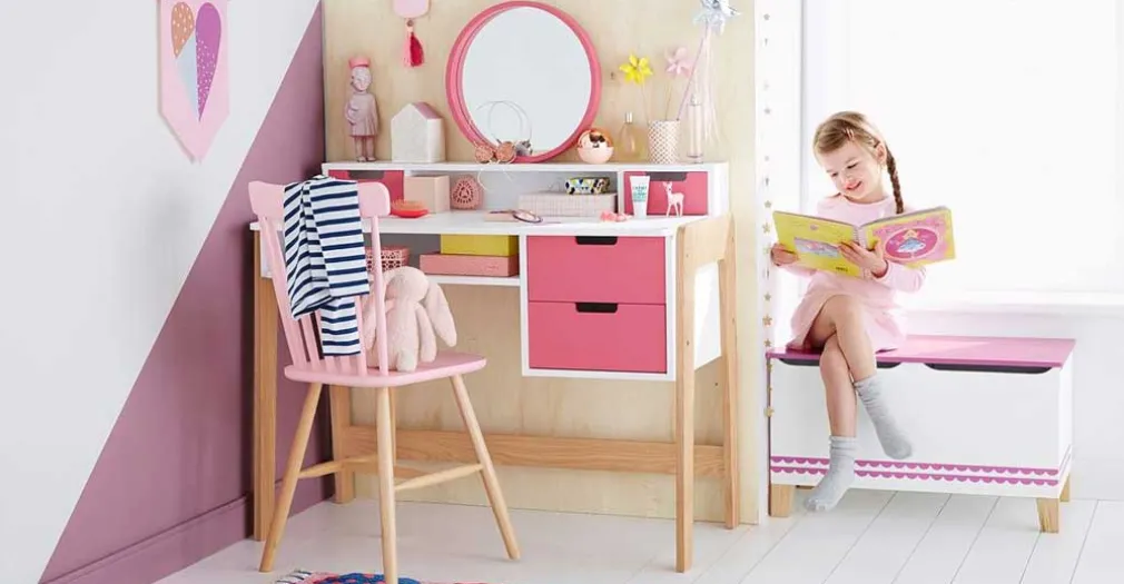 El Escritorio Tocador Colour Blocs – Rosa es la mesa perfecta para tu niña. Incluye un espejo que transforma este mueble en un espacio de juegos y diversión único.