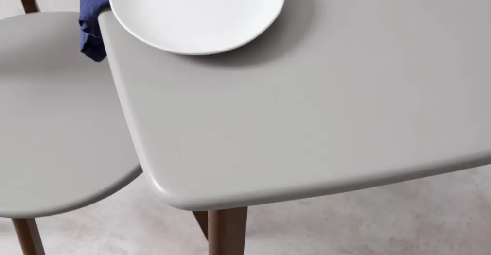 Conformado por una Mesa de Comedor rectangular en madera laminada en roble oscuro lacado en gris, apoyada en 4 patas de madera, de alta resistencia y muy adecuado para uso diario y exteriores.