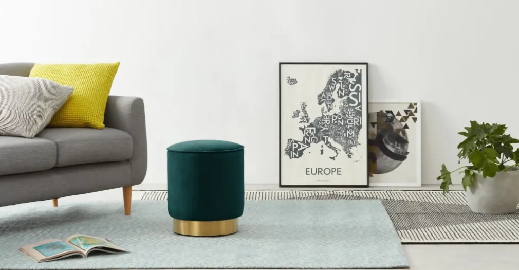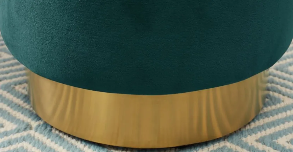 Con suave tapiz y base color dorado, esta fabricado el Puf Pequeño con Base de Acero Inoxidable Hetherington, perfecto para reposar los pies o como asiento adicional cuando tienes invitados.