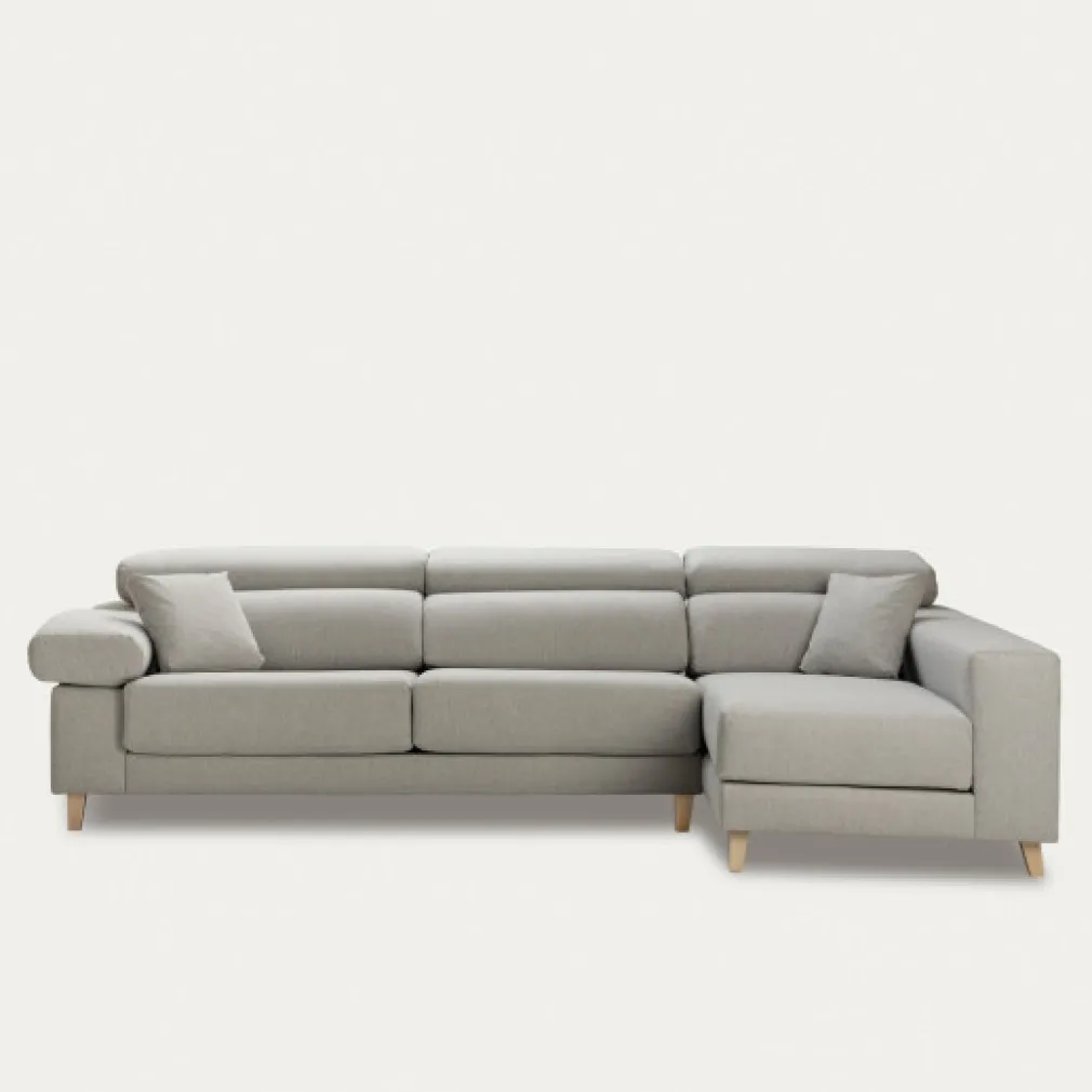 El Sofá Air con chaise presenta un diseño moderno en tonos grises y patas de madera, es la elección ideal para quienes buscan estilo y comodidad. Su funcionalidad lo convierte en el complemento perfecto para transformar tu salón en un verdadero refugio de confort, adaptándose a cualquier espacio y necesidad.