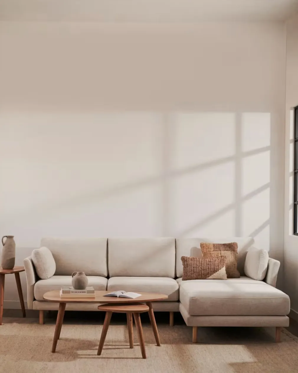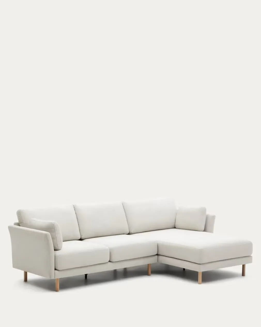 El Sofá Gilma con chaise es una pieza elegante y práctica, ideal para cualquier hogar. Su diseño moderno y nórdico, con acabado color Perla y patas de madera, se adapta a diversos entornos. Sin duda es perfecto para reuniones familiares.
