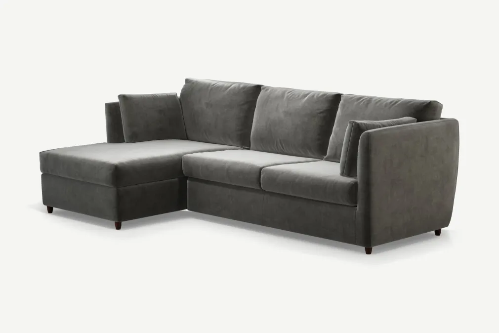 El Sofá en L Milner de Yolodecoro se convierte en una pieza de lujo y de primera elección para compartir en familia. Ostenta de un magnífico tapizado, amplio espacio de almacenaje, levantas la chaise longue y tendrás a la mano cojines, sábanas y lo que desees conservar cerca de tu comodidad.