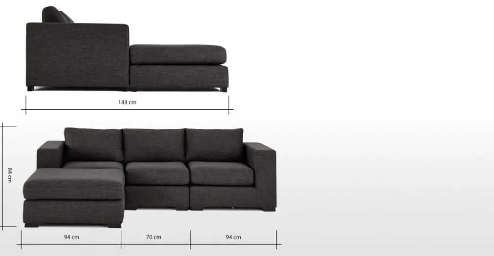 Medidas de Sofá: Alto: 84 cm | Ancho: 258 cm | Profundo: 94/188 cm