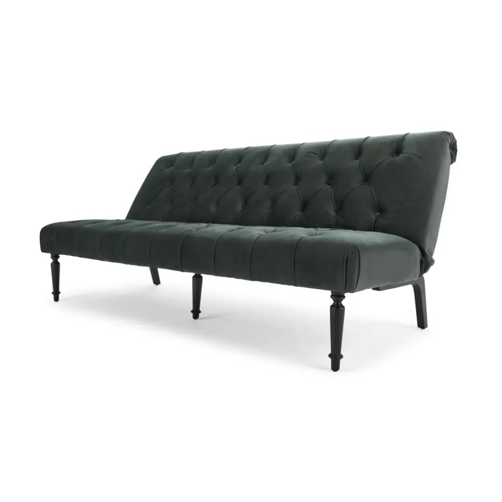 Esta pieza destaca en la colección vanguardista de sofá, sus valores estéticos atractivos y singulares se vislumbran en la confección de su respaldo con botones hundidos al igual que los asientos, descansando en unas largas patas de madera en acabado negro para un soporte máximo.