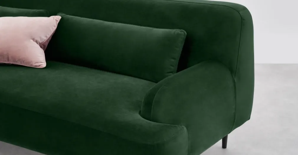 El Sofá Giselle – Verde Pino es refinado con curvas pronunciadas de estilo nórdico que inspira, patas delgadas al estilo escandinavo y recubierto de un suave terciopelo.