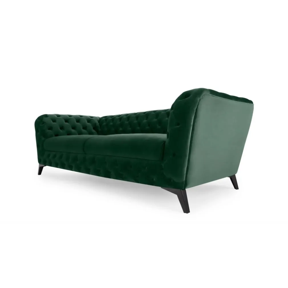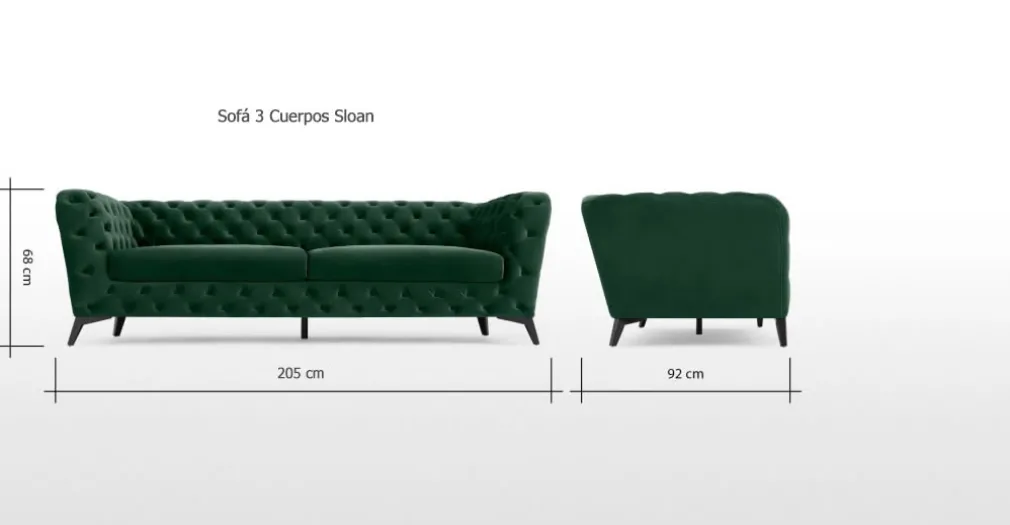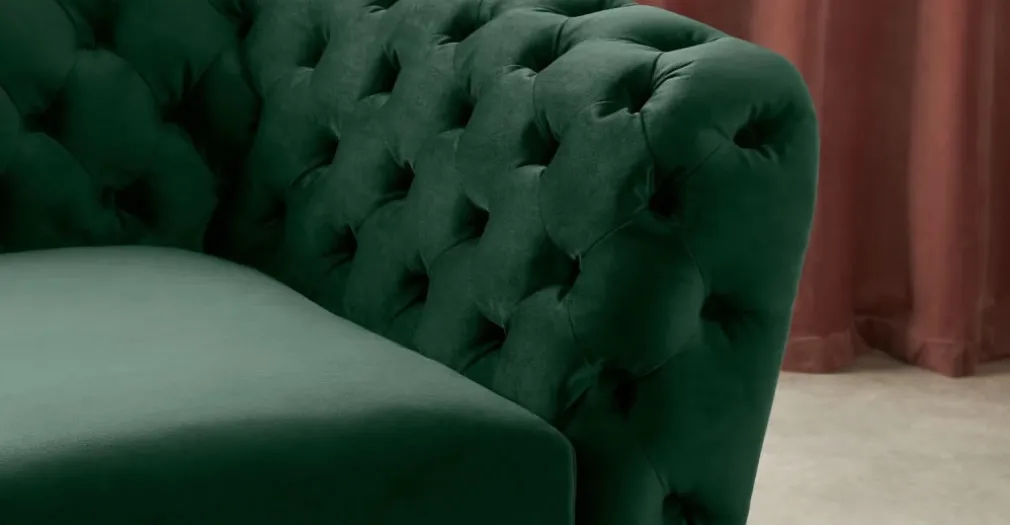 Su estructura tapizada en terciopelo verde suave y firme , mientras que sus cojines son tan cómodos y su diseño con botones en el respaldo, reposabrazos para cautivar desde el lugar en que lo ubiques, dando a tu ambiente frescura y armoría.