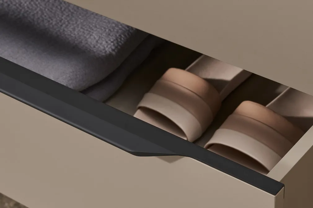 El cajón de almacenamiento inferior cuenta con un encantador detalle con una agarradera en acabado negro, que agrega un toque de elegancia y originalidad al diseño y el acabado en color capuccino ofrece calidez, lo que añade una sensación de sofisticación a tu espacio.