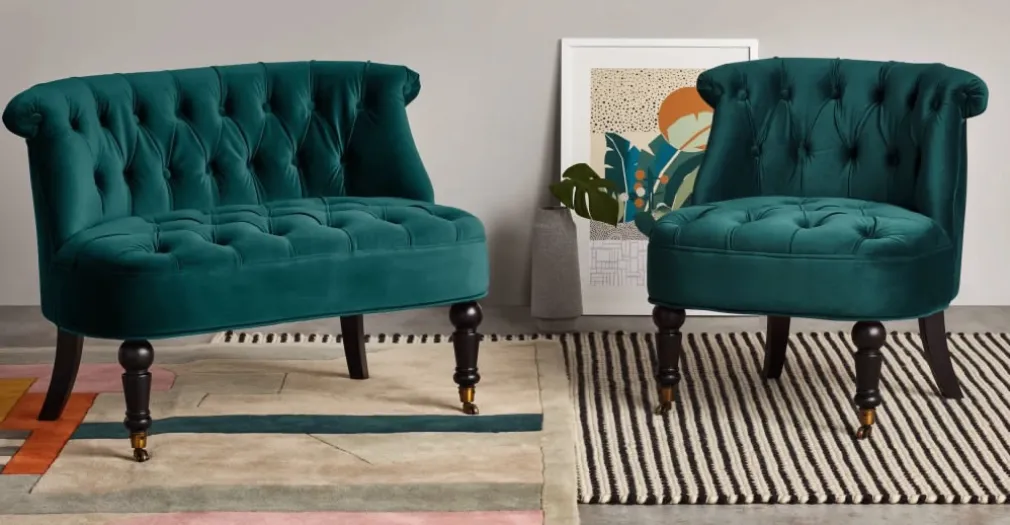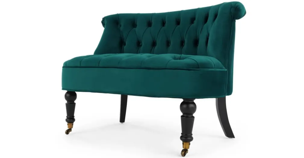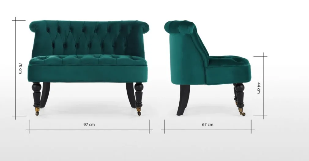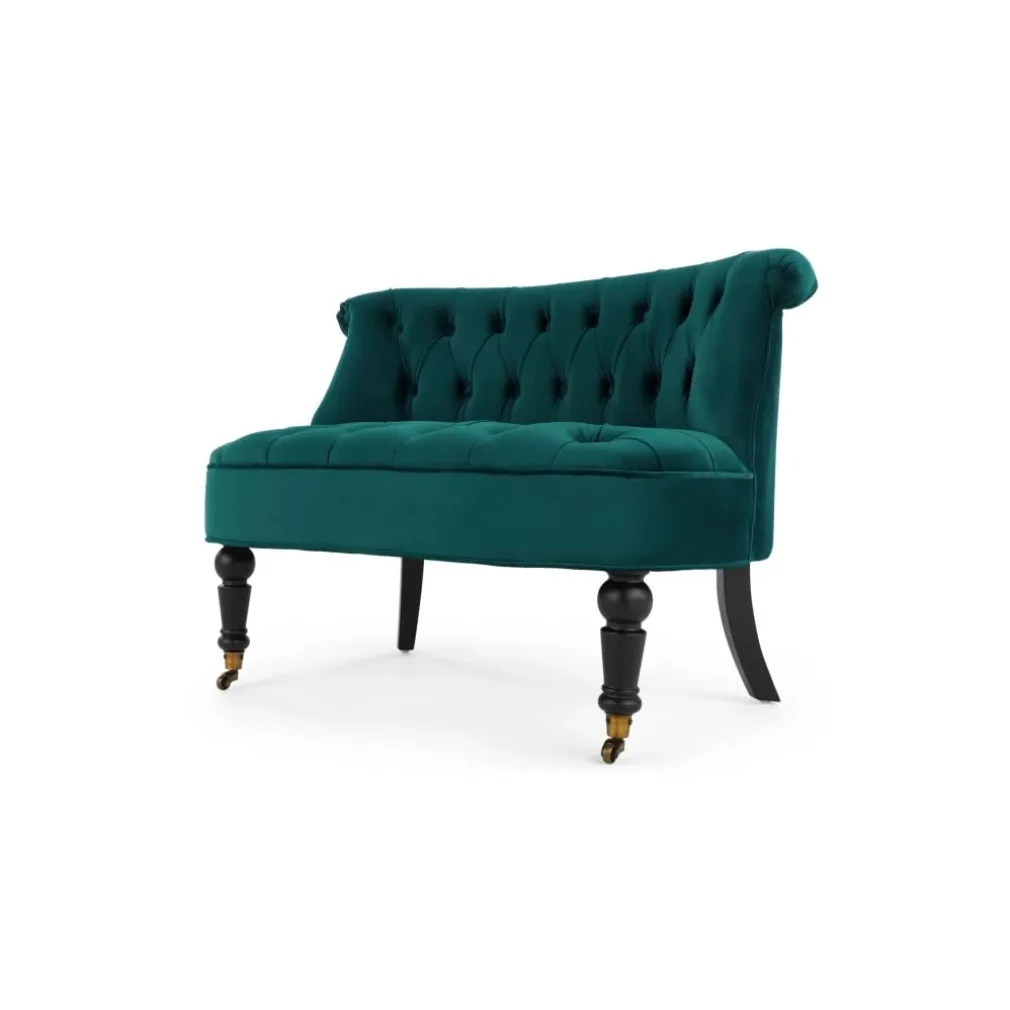 Este Sillón para 2 Bouji está pensado para pasar mucho tiempo sentado. Un acabado distinguido, con detalles de botones texturizados, patas de madera Torneadas., asiento y respaldo cómodos y acolchados.