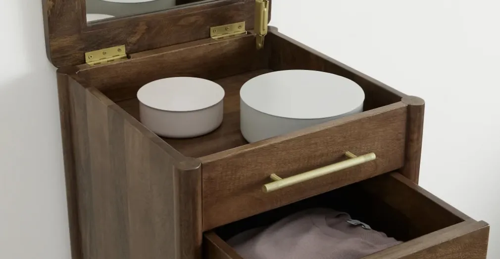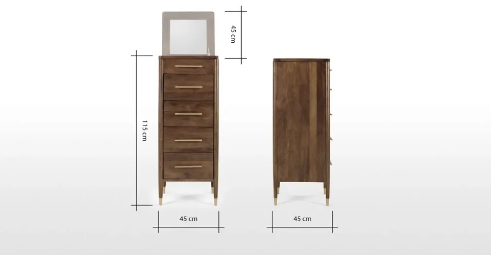 Su amplio almacenaje, diseño y acabado hacen de Cómoda Alta Hix – Mango una pieza elegante; empezando por el espejo que guarda en su tablero el cual es fácil de utilizar, sus cajones cada uno luciendo un jalador dorado anexado a ellos sus correderas Metálicas. para su perfecto funcionamiento al momento de guardar tus cosas.