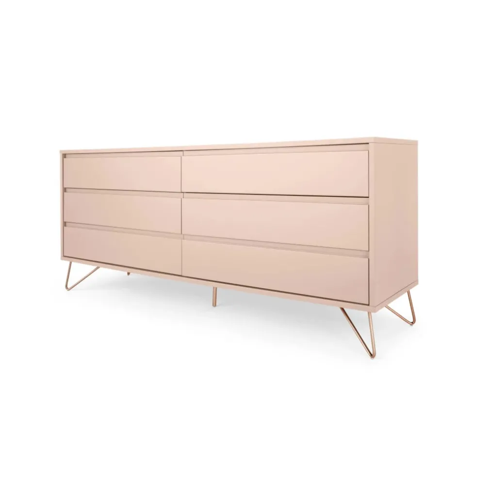 La Cómoda Ancha Elona – Rosa Empolvado, es un mueble de mayor elegancia ,cuenta con 6 cajones de amplio almacenaje, práctico y de tendencia en muebles de dormitorios, Sus amplios cajones te permitirá organizar en mayor proporción tu dormitorio; asimismo su acabado en color rosa y patas de acero, logra dar a tu habitación un aspecto inpecable en cuanto a diseño y calidad de materiales. La Cómoda Ancha Elona – Rosa Empolvado que Yolodecoro te trae, está fabricada con materiales de alta calidad; participando en ella el Melamine 18 mm y estructura de base madera y el acero.