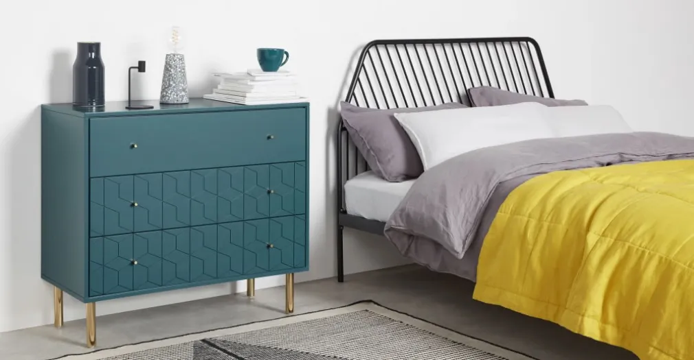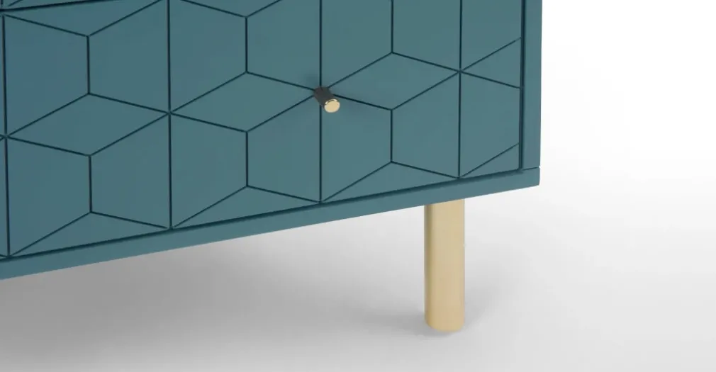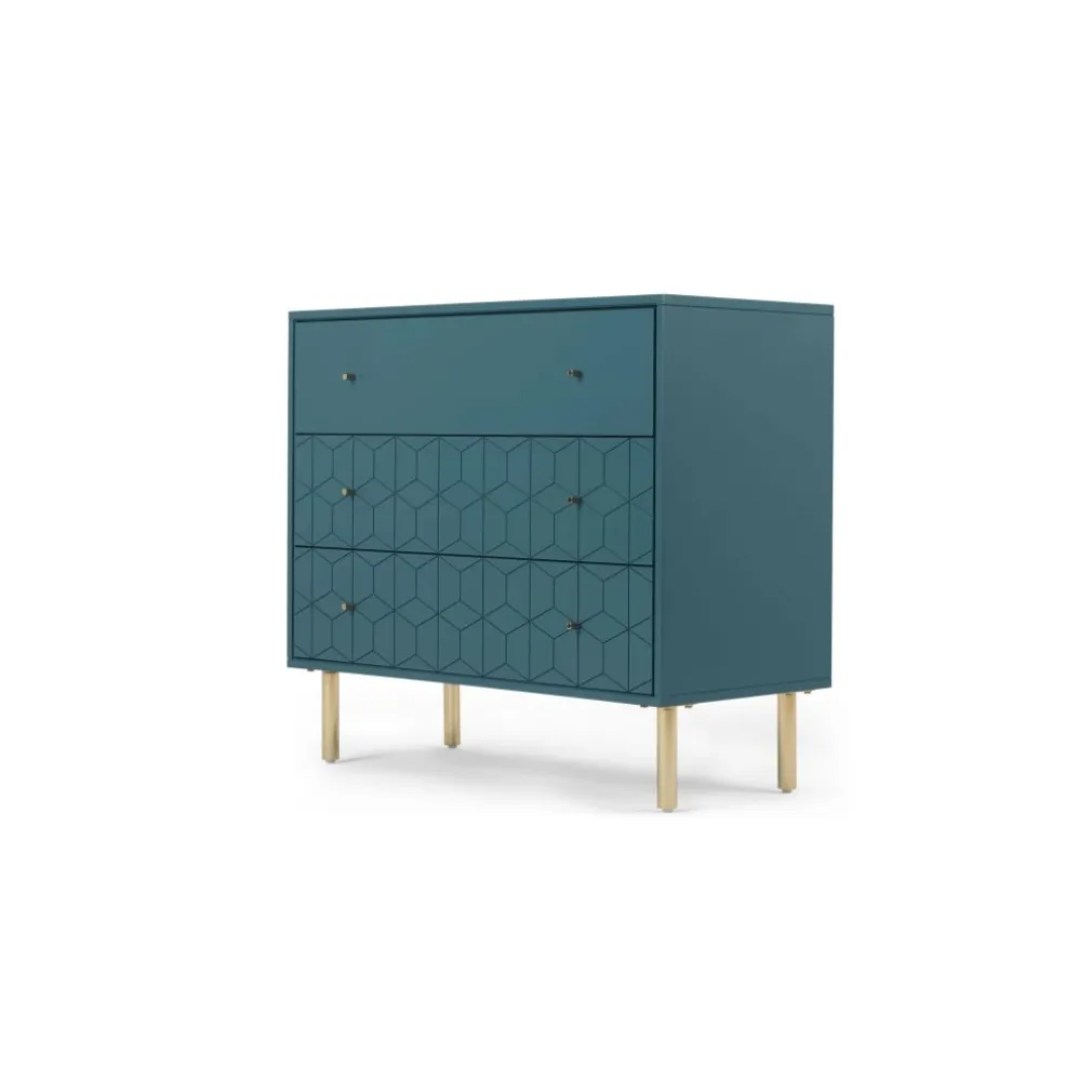 Amplia y distinguida es la Cómoda Hedra – Azul, una pieza importante al momento de ordenar tu habitación, sus líneas geometrías se aprecian en el segundo y tercer cajón siendo uno de sus atractivos, patas de acabado dorado, sin duda YoloDecoro siempre está trayendo mobiliario para embellecer el espacio predilecto de tu hogar.