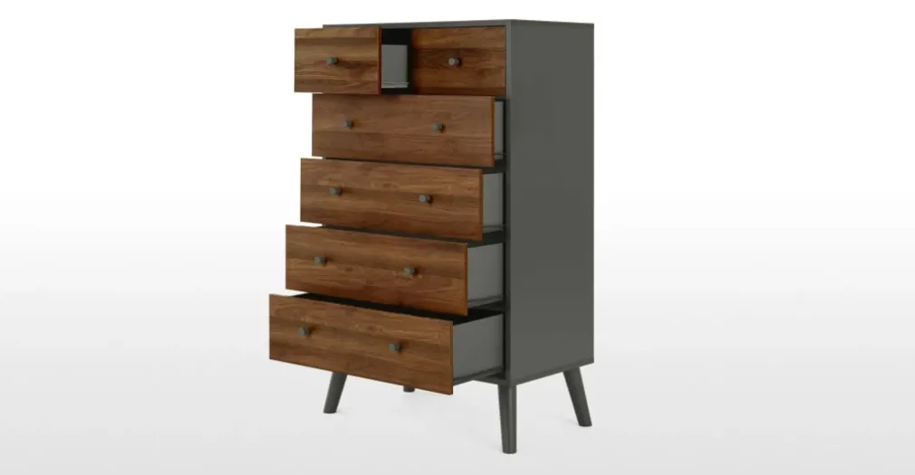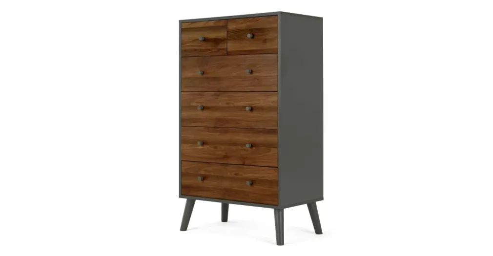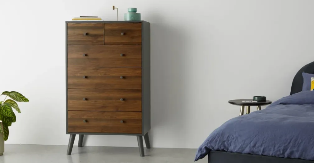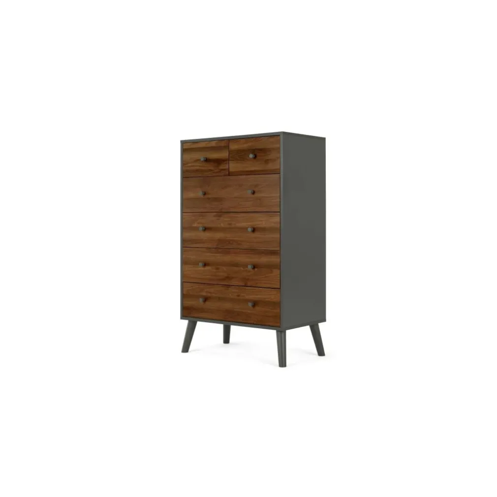 Yolodecoro, pensando en ti, trae a tu dormitorio la Cómoda Larsen – Efecto Nogal y Gris con 6 cajones de diferentes tamaños, su silueta es un diseño muy atractivo para tu dormitorio; una pieza decorativa, funcional y de calidad.
