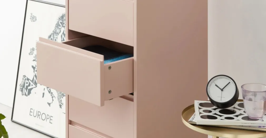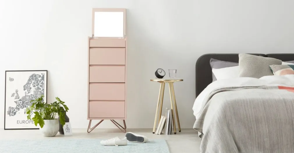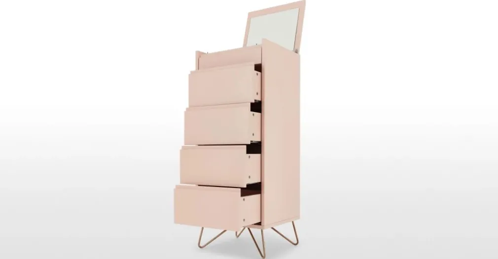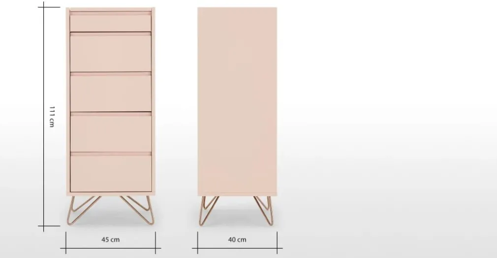 La Cómoda Tocador Elona – Rosa Empolvado , es un mueble que cuenta con 5 cajones, espejo elevable muy práctico, permitiendo organizar tu dormitorio; su acabado en color rosa y patas en acabado dorado, logra dar a tu habitacion un aspecto envidiable en cuanto a diseño y calidad de materiales. La Cómoda Tocador Elona – Rosa Empolvado que YoloDecoro te presenta, está fabricada con materiales de alta calidad como Melamine 18 mm y estructura de base madera, patas de acero.