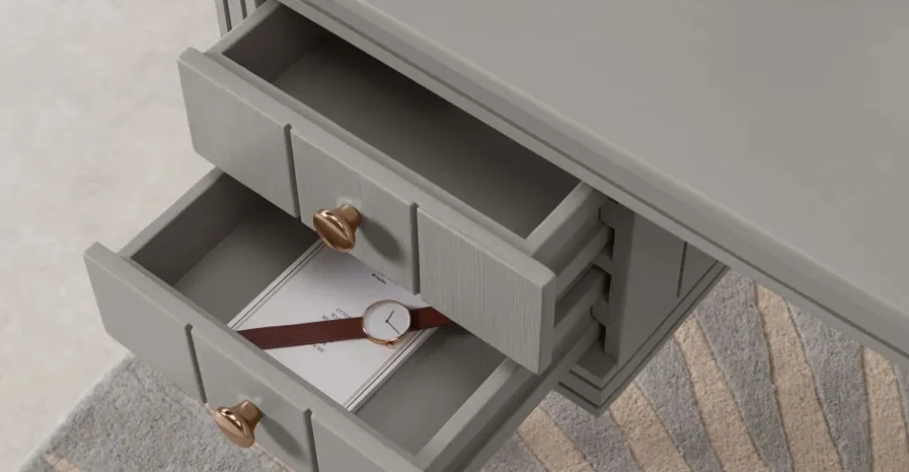 Impresiona con este estilo tu lugar de trabajo, adecuado para pocas dimensiones, con accesorios en sus cajones propios de la linea neoclásica.