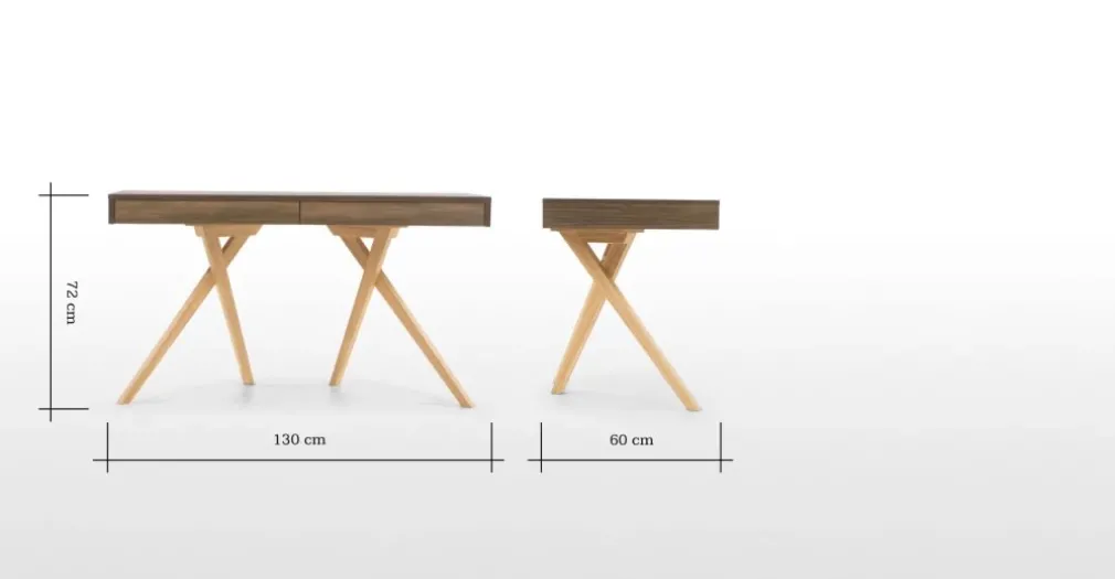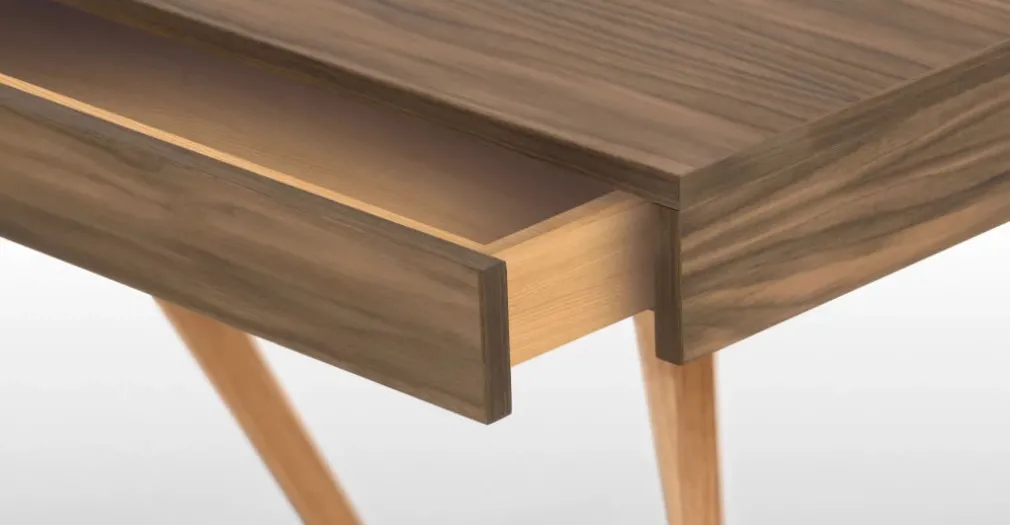 Sus disimulados cajones de dimensiones exactas a la lámina principal te ofrecen un espacio para guardar tus artículos y documentos sin modificar su diseño. La altura de sus patas cruzadas le da un nivel a este escritorio que toma en consideración la ergonomía como un concepto clave para tu salud y la comodidad en el puesto de trabajo.