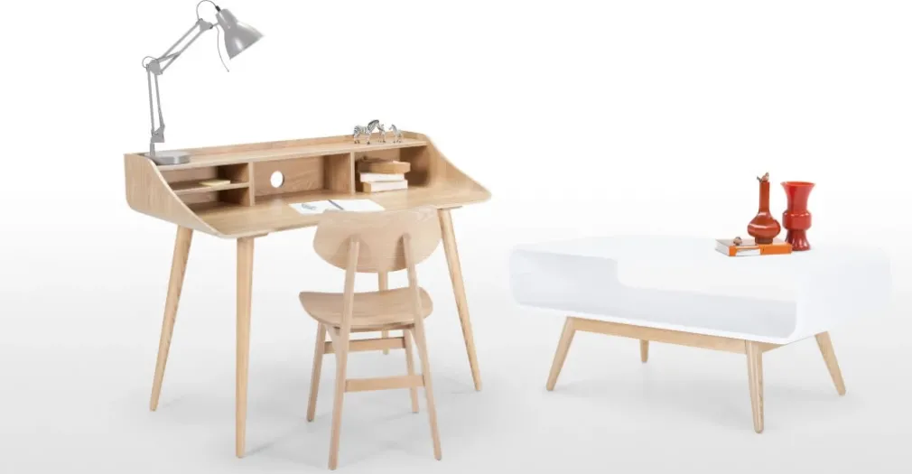 Es una mesa compacta con un espacio acorde para un buen almacenaje en tonalidad blanca el cual reposa sobre patas angulares en madera maciza color natural, el laminado en fresno como material fundamental le concede resistencia.