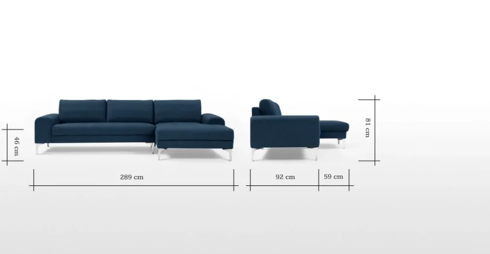 Medidas de Sofá: Alto: 81 cm | Ancho: 289 cm | Profundo: 92/151 cm.